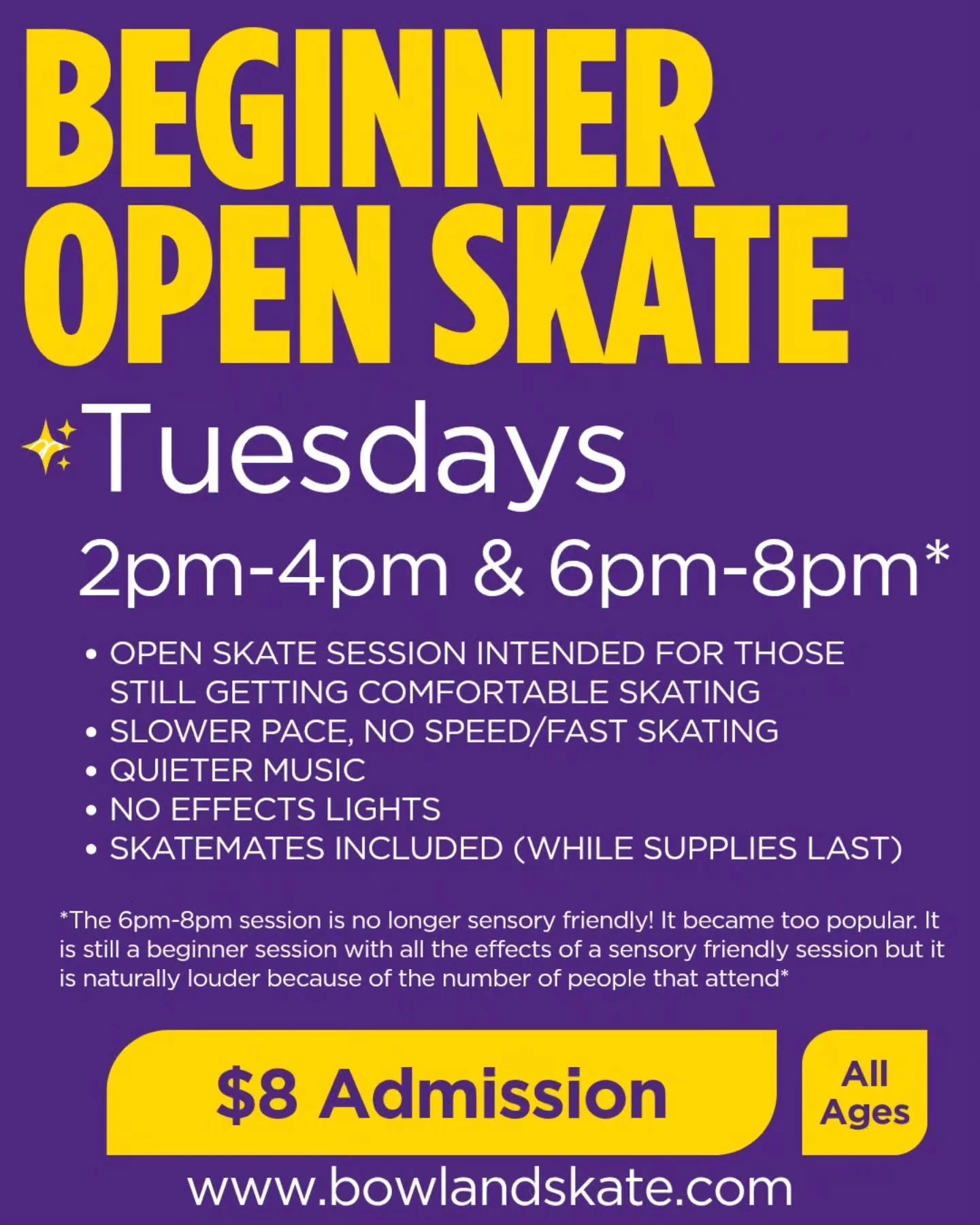 *The 2pm-4pm session is SENSORY FRIENDLY. The 6pm-8pm session is no longer sensory friendly due to the amount of people that show up, however it is still a beginners session.