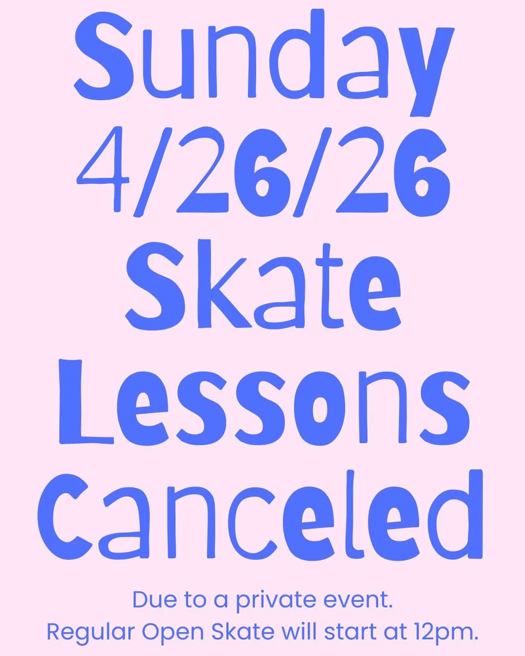 Skate Lessons canceled Sunday 4/26/26 due to private event